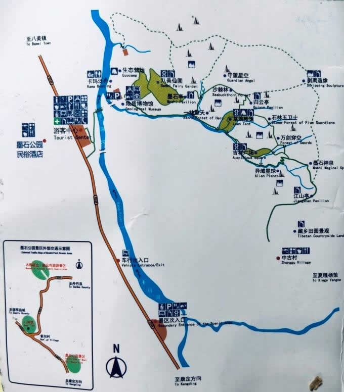 中國墨石公園景區(qū)位于四川省甘孜州道孚八美鎮(zhèn)卡瑪村與中古村交界處,地處中國最美景觀大道318國道核心區(qū),緊鄰丹巴美人谷、康定新都橋、雅江康巴漢子村等知名景區(qū),距八美鎮(zhèn)約6公里,川藏公路旁400米處。面積5平方公里,海拔約3500米。是香格里拉之巔海螺溝通向香格里拉之魂稻城亞丁的中轉(zhuǎn)站,擁有壯美草原、婉約濕地、奇幻墨石、特色民居、高原花海、金色彩秋、白塔圣寺、日出日落八大奇觀!按嘿p格桑夏避暑,秋觀彩林冬踏雪”是一年四季風光的特色,而綿延在鮮水河斷裂帶上的墨石天然景觀更為世人向往,被譽為“中國最美景觀大道第八美”。