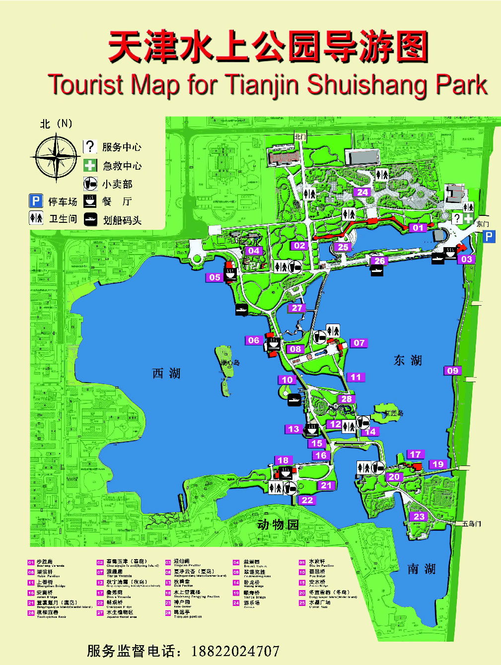 園中南、北部分為大塊陸地,中間是廣闊的水面,水中有11個小島,分別由拱橋、曲橋、平橋和桃柳堤連接,湖水映著朱紅樓閣,湖中碧波蕩漾,游人可劃船漫游湖上。構(gòu)成這座公園獨具特色的水上世界。位于水上公園南部的動物園,面積50.5公頃。園內(nèi)有動物獸舍31處,如:大象館、熊貓館、百鳥籠及海獸館、獅虎山等。還有鹿、羊等溫順動物的放養(yǎng)區(qū)。全園內(nèi)共有野生動物近147種,1400余只。到2005年,計劃動物類種發(fā)展到220個,總數(shù)量接近3000只。