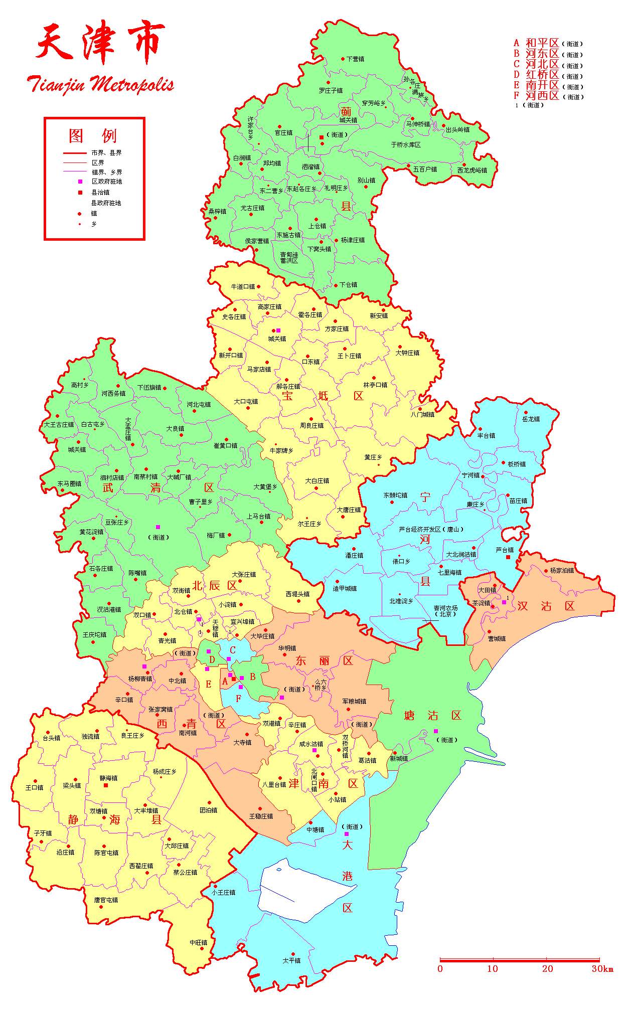 天津市簡稱津,它地處華北平原東北部,渤海之濱,總面積11919.7平方公里,素有渤海明珠之稱。全市13個區(qū)、5個縣,為中央直轄市和十四個沿海開放城市之一。人口1000萬,有漢、回、朝鮮、滿、蒙古等民族。