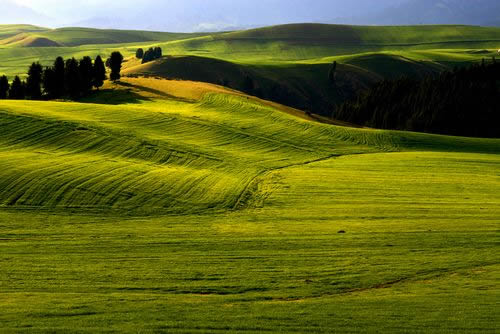 秋季,一眼望不到邊的山巒上,起伏的金黃色麥浪,麥田,大捆大捆的麥垛。金黃色的田間,會點綴幾顆古樸的大樹,旁邊是牛羊和房屋——這幅畫面,就算歐洲最出名的芭比松莊園,世界頂尖油畫家梵高、莫奈等人寫生的村莊,也不過如此。