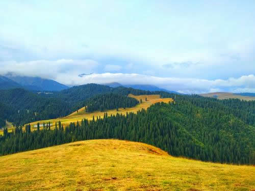 夏季,在每年的6、7月份是避暑消夏的季節(jié)。初到這里的人,會錯覺以為到了瑞士:沒膝的黨生花、貝母花和一種叫不上名的小黃花漫山遍野,就像神仙種植的一樣,在草地里自然生長為好幾層。爭奇斗妍,沁人心脾的花香令人陶醉;遠處群山起伏,層巒疊嶂,連綿不斷,蒼松翠柏直插云霄,雪峰、林海和綠草鮮花構(gòu)成了一副秀麗的山水畫卷;行走在這綠茸茸、濕漉漉的草地上,涼風(fēng)習(xí)習(xí),盡情呼吸新鮮的空氣和花草的芳香,一種心靈被大自然凈化的感覺油然而生。再往里面走就是雪山,皚皚的積雪終年不化。騎馬可以到達雪山腳下,那里溫度急劇下降,剛才還是短褲T恤,就得穿上厚棉衣。身上還是烈日曬著,頭頂一朵云飄過,很可能就是一陣瓢潑大雨,讓你看著太陽卻渾身濕透。過一會雨停了,山風(fēng)已不知不覺吹干了你的衣服。