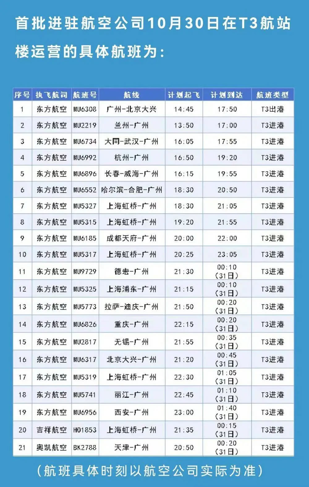 10月31日起,東方航空、上海航空、中國聯(lián)合航空、吉祥航空、奧凱航空的國內(nèi)進出港航班均調(diào)整至白云機場T3航站樓運營,東方航空的國際航班暫保留在T1航站樓運營。