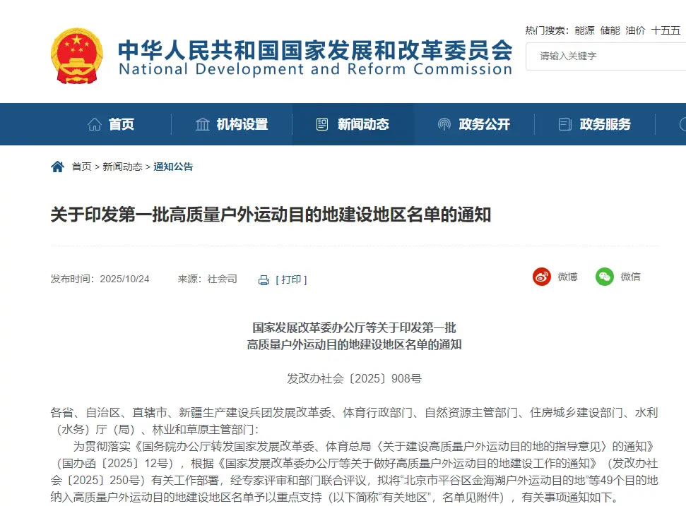 第一批高質量戶外運動目的地建設地區(qū)名單