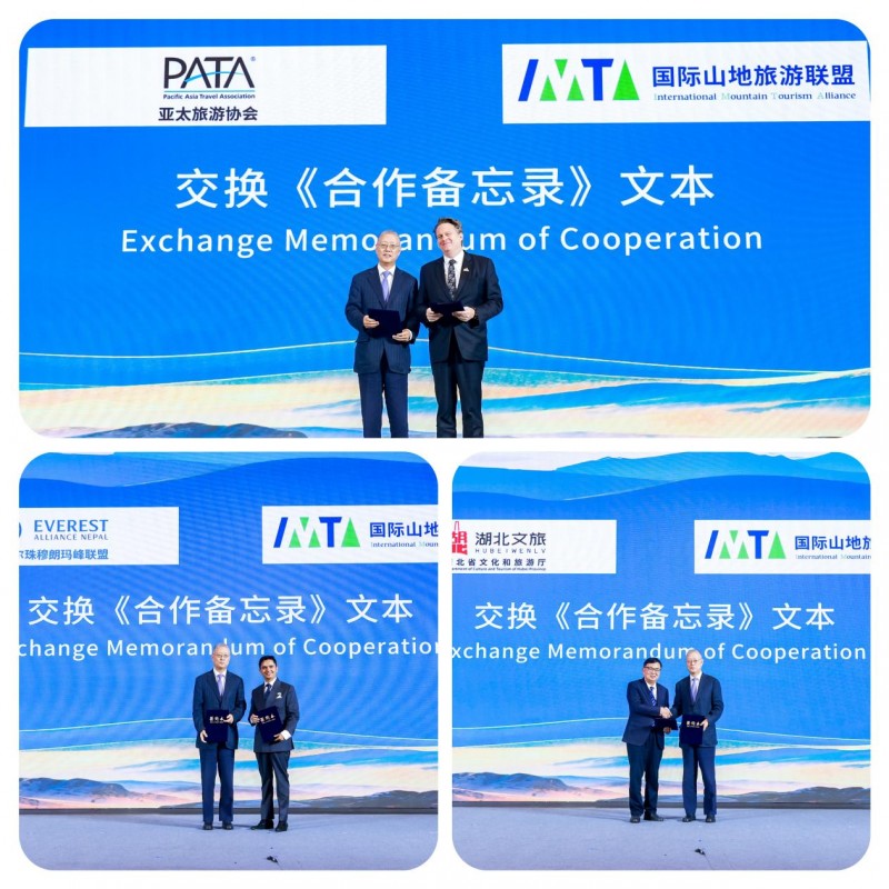國(guó)際山地旅游聯(lián)盟副主席兼秘書長(zhǎng)何亞非分別與亞太旅游協(xié)會(huì)主席彼得·西蒙(Peter Semone)、尼泊爾珠穆朗瑪峰聯(lián)盟主席蘇大山·尼泊爾(Sudarshan Nepal)、湖北省文化和旅游廳副廳長(zhǎng)徐勇交換合作備忘錄,旨在通過資源共享、優(yōu)勢(shì)互鑒,為全球旅游業(yè)可持續(xù)增長(zhǎng)注入新動(dòng)能、貢獻(xiàn)實(shí)踐力量。
