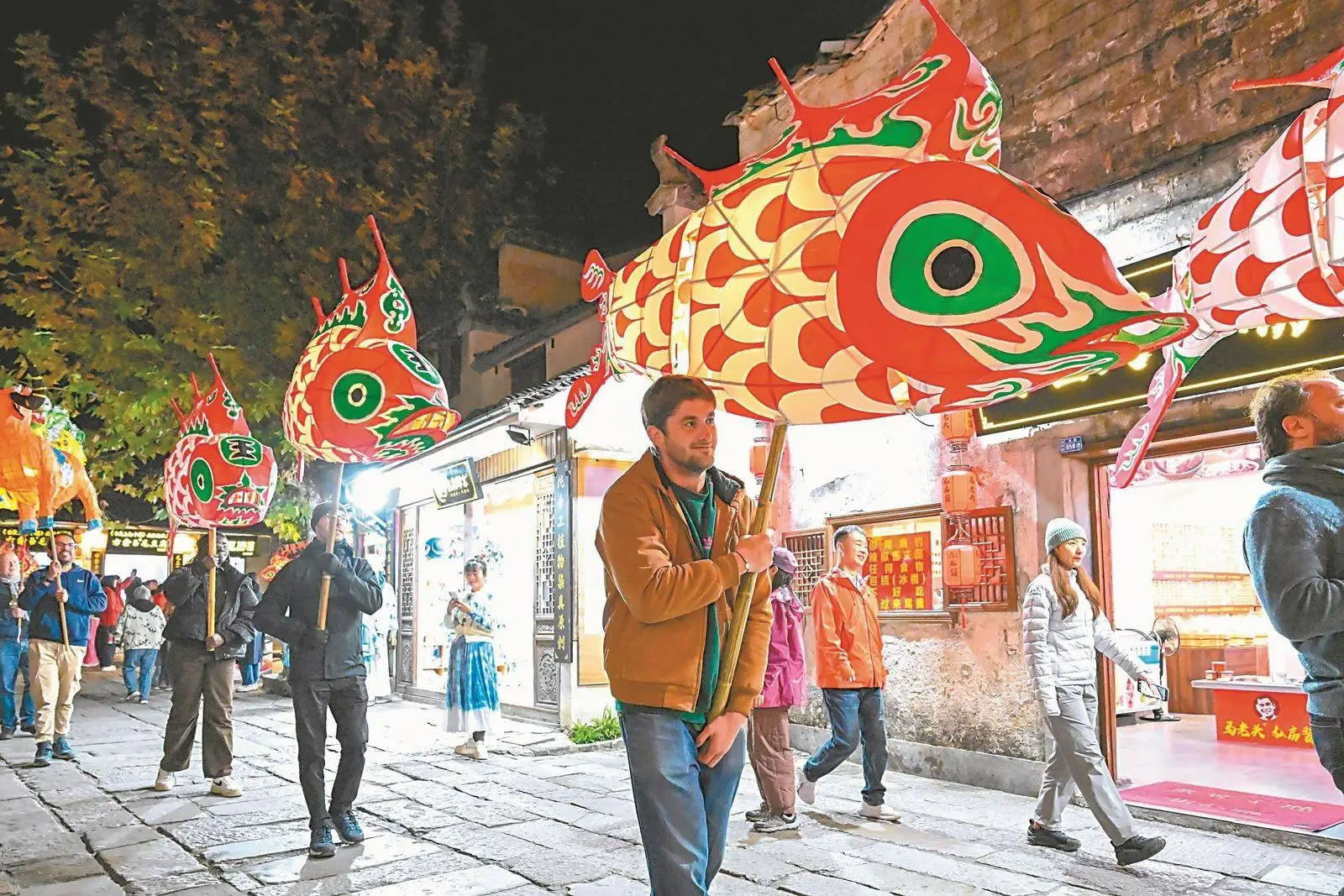 11月15日,在黟縣宏村景區(qū),外國游客在體驗非遺魚燈表演。通訊員趙明攝