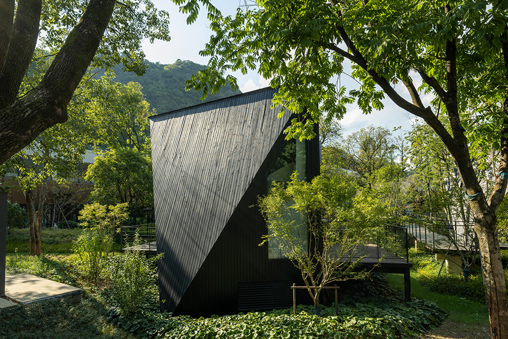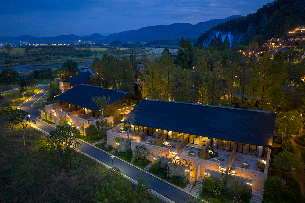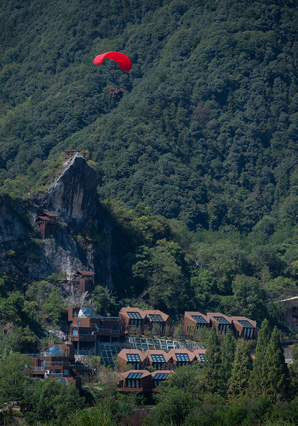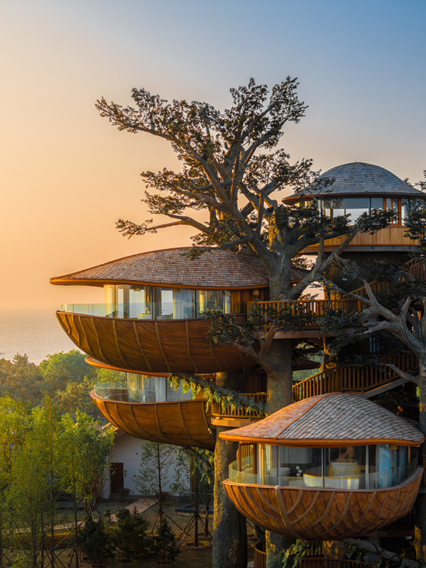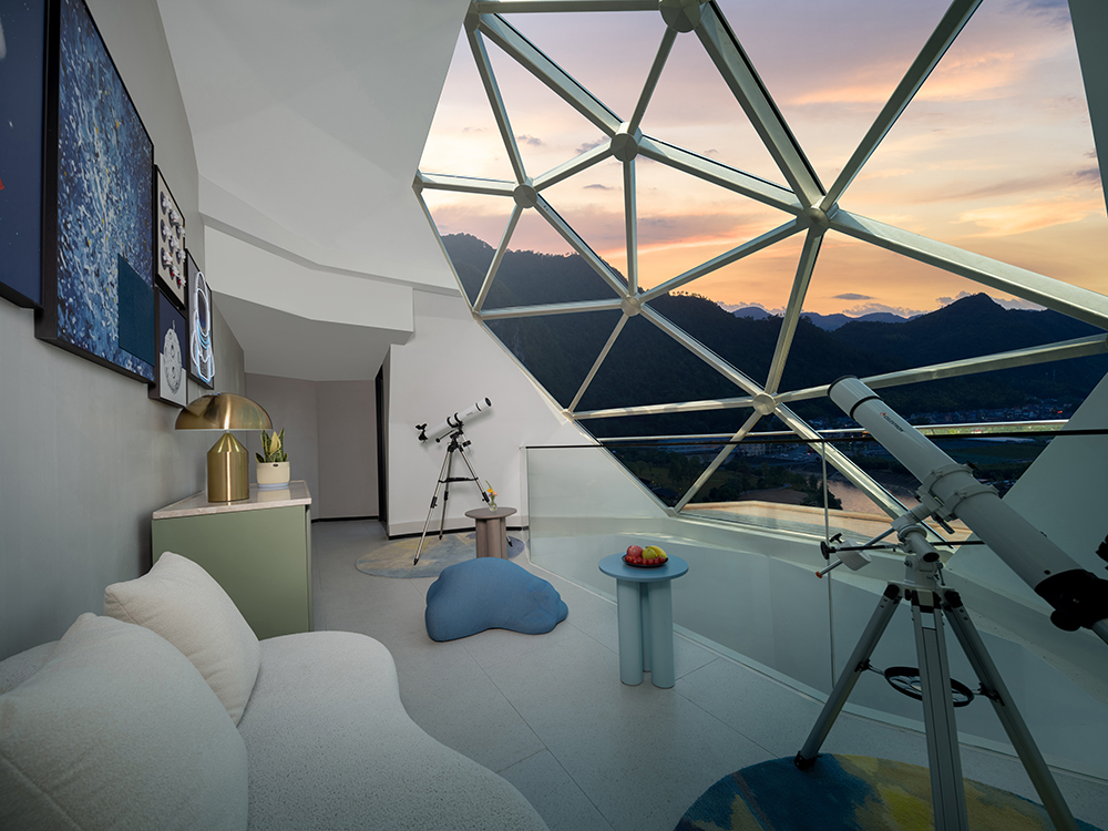 架空設(shè)計的海螺屋客房隱于林間,如同童話故事中的精靈居所,為住客營造出私密而夢幻的休憩空間;天文臺客房懸于巖壁之上,通過客廳的望遠鏡和全景天窗可賞星河美景,將浩瀚星空引入室內(nèi);炭晶舍客房以傳統(tǒng)炭雕藝術(shù)為靈感,通體的炭黑色藝術(shù)感十足,展現(xiàn)出材料與自然的深度對話;復(fù)式結(jié)構(gòu)的玉江舍客房,則讓賓客在空間轉(zhuǎn)換中,收獲山川、江潮等不同的觀景視野,實現(xiàn)移步換景的居住意境。