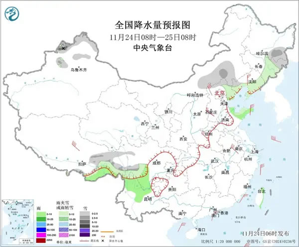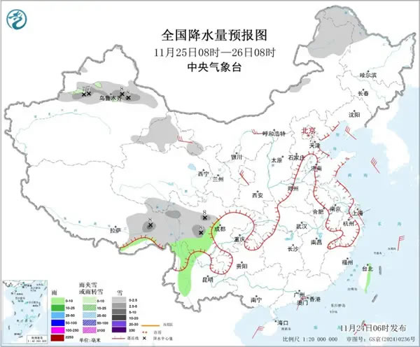 中國天氣網(wǎng)訊 進入11月下旬,影響我國的冷空氣較為頻繁。目前,一股較強冷空氣正自西向東影響我國,今明天(11月24日至25日),冷空氣繼續(xù)東移南下,東北、華北東部到華南等地都將出現(xiàn)降溫。緊接著,25日至27日,又將有新一股冷空氣影響我國。此外,我國西南地區(qū)、東北等地雨雪天氣頻繁,局地或現(xiàn)大雪。