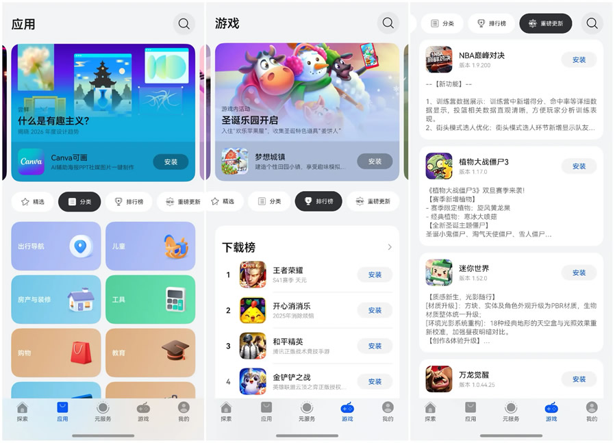 體驗路徑:打開AppGallery,在“應用”或“游戲”頁,點擊腰部的“分類”、“排行榜”或“重磅更新”查看