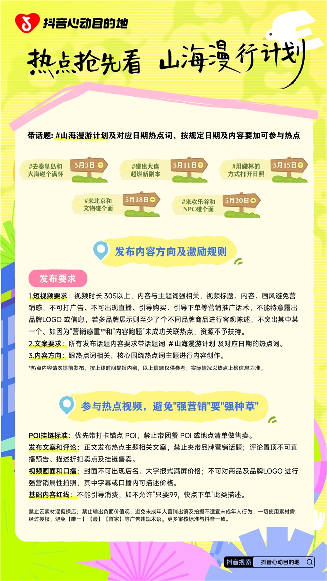 五一在即,暑假在望,想出去瘋玩的心情已到頂峰。這個春夏,抖音生活服務「山海漫行計劃」攜手北京、秦皇島、日照、大連四大心動目的地,聚焦親子出游與小長假出游場景,聯(lián)動22家頭部本地商家,從熱門景區(qū)到親子酒店,從千年文明到電音狂歡,打包一整個春夏的靈感玩法。不管是遛娃的潮爸辣媽,還是城市玩家,跟上節(jié)奏,一起奔赴北方山海!