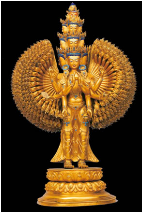 西藏本土制造的宗教文物,以金銅造像最著名。羅布林卡興建之初,七世達(dá)賴(lài)為給剛建好的宮殿佛堂添裝佛像及佛教用具,曾在布達(dá)拉宮腳下建立了一所名為“雪堆白”的造像場(chǎng),匯集了藏區(qū)內(nèi)幾百名能工巧匠,在這里精心打造各種佛像器物,以滿足拉薩及周邊地區(qū)寺院的需求。羅布林卡從初建到最后完善,每座佛堂里的大小佛像都被指定由“雪堆白”工匠量身定做打造。除此之外,園內(nèi)很多佛龕、宗教用具、金頂屋檐、門(mén)楣雕飾等,也都出自“雪堆白”工匠之手!把┒寻住痹煜裉攸c(diǎn)是制作精細(xì)、比例勻稱(chēng)、色彩鮮明艷麗,佛像上的鍍金厚重,鍍金面光潔度高,佛冠、耳墜、臂釧、手鐲、飄帶等飾物,一律用綠松石鑲嵌。這些明顯特征,說(shuō)明18世紀(jì)中葉以后,西藏本土佛像打造技術(shù)已步入了獨(dú)立發(fā)展的成熟階段。