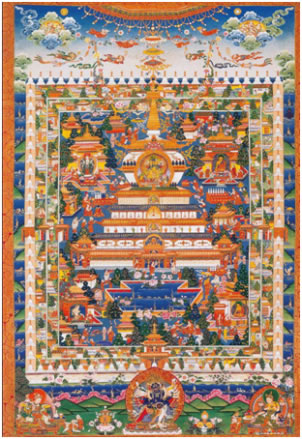 除佛像、佛塔外,唐卡收藏也是一大亮點(diǎn)。羅布林卡珍藏了大量18到20世紀(jì)勉唐畫(huà)派、欽則畫(huà)派和嘎赤畫(huà)派的各類(lèi)作品。早期唐卡著名的有覺(jué)仲師徒像、帕木竹巴·多吉杰布像、印度尊者比瓦巴、那若巴像。其中覺(jué)仲師徒像唐卡,描寫(xiě)的是印度尊者,噶當(dāng)派始祖阿底峽向貼身弟子仲敦巴(師徒合稱(chēng)“覺(jué)仲”)傳授佛法的故事。畫(huà)面中心主尊阿底峽頭戴錐形遮耳帽,身披袈裟,雙手結(jié)說(shuō)法印,給身旁仲敦巴講法,仲敦巴著藏式袍服,結(jié)跏趺坐,側(cè)身聆聽(tīng)大師教誨。畫(huà)面上、下分別繪有如來(lái)、藥師、觀音、度母諸佛及繪畫(huà)施主像,人物刻畫(huà)逼真、栩栩如生,背景以朱砂填色,輪廓用金線勾勒。這件13世紀(jì)繪制的“赤唐”作品,十分稀有,彌足珍貴。另外,在收藏諸多的嘎赤畫(huà)派作品中,以84位印度大成就者唐卡最具特色。這些唐卡的畫(huà)面,不同以往其他畫(huà)派作品,構(gòu)圖較為簡(jiǎn)潔,色彩淡雅。人物形態(tài)被描繪的極為夸張,塑造了一個(gè)個(gè)特殊而詼諧逗趣的大成就者形象。這種一反常態(tài)的畫(huà)風(fēng)作品,在外邊難得一見(jiàn)。還有以唐卡形式繪制的《四部醫(yī)典系列掛圖》,收藏也比較完整。系列掛圖,藏族稱(chēng)為“曼唐”,它是以彩色連環(huán)畫(huà)形式系統(tǒng)描述了藏醫(yī)藥學(xué)的基本理論,人類(lèi)解剖構(gòu)造,生理功能、疾病診斷治療方法,各種藥物種類(lèi)以及人類(lèi)如何養(yǎng)生保健、飲食搭配等內(nèi)容!奥啤敝谱魍晟朴谇宕迨肋_(dá)賴(lài)?yán)锇⑼迳<未雸?zhí)政時(shí)期。最早成79幅,1916年十三世達(dá)賴(lài)?yán)锪钊擞衷鲅a(bǔ)了一幅“歷代西藏名醫(yī)圖”,形成80幅。這批系列掛圖,被視為標(biāo)準(zhǔn)藍(lán)本,完整保存在羅布林卡內(nèi)。