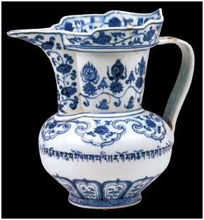 明宣德時(shí)期(公元1426年--1435年)贈(zèng)送的青花纏枝蓮紋僧帽壺,高23cm,底徑9cm。該壺是仿藏傳佛教僧人的僧帽所制,故稱(chēng)“僧帽壺”。壺的通體飾青花紋樣,腹部書(shū)寫(xiě)一圈藏文,意為“晝吉祥、夜吉祥、正午吉祥、晝夜吉祥、三寶吉祥”。但這圈銘文中的藏文字母和分隔符號(hào)書(shū)寫(xiě)有誤,可見(jiàn)這是不通藏文的漢族工匠仿書(shū)。足墻飾美麗的卷草紋,器底青花雙圈書(shū)寫(xiě)兩行六字“大明宣德年制”。宣德青花瓷以其古樸典雅的造型,晶瑩艷麗的釉色,多姿多彩的紋飾聞名于世。宣德時(shí)期西藏與內(nèi)地往來(lái)綿密,大量的青花瓷做為皇帝贈(zèng)品傳入西藏。西藏上層為保存這些瓷器不致受損,還用金屬或皮革制成瓷套盛裝。此件瓷壺從造型到紋飾,多含西藏元素,顯然它是朝廷命景德鎮(zhèn)官窯專(zhuān)門(mén)燒制贈(zèng)予西藏上層的。