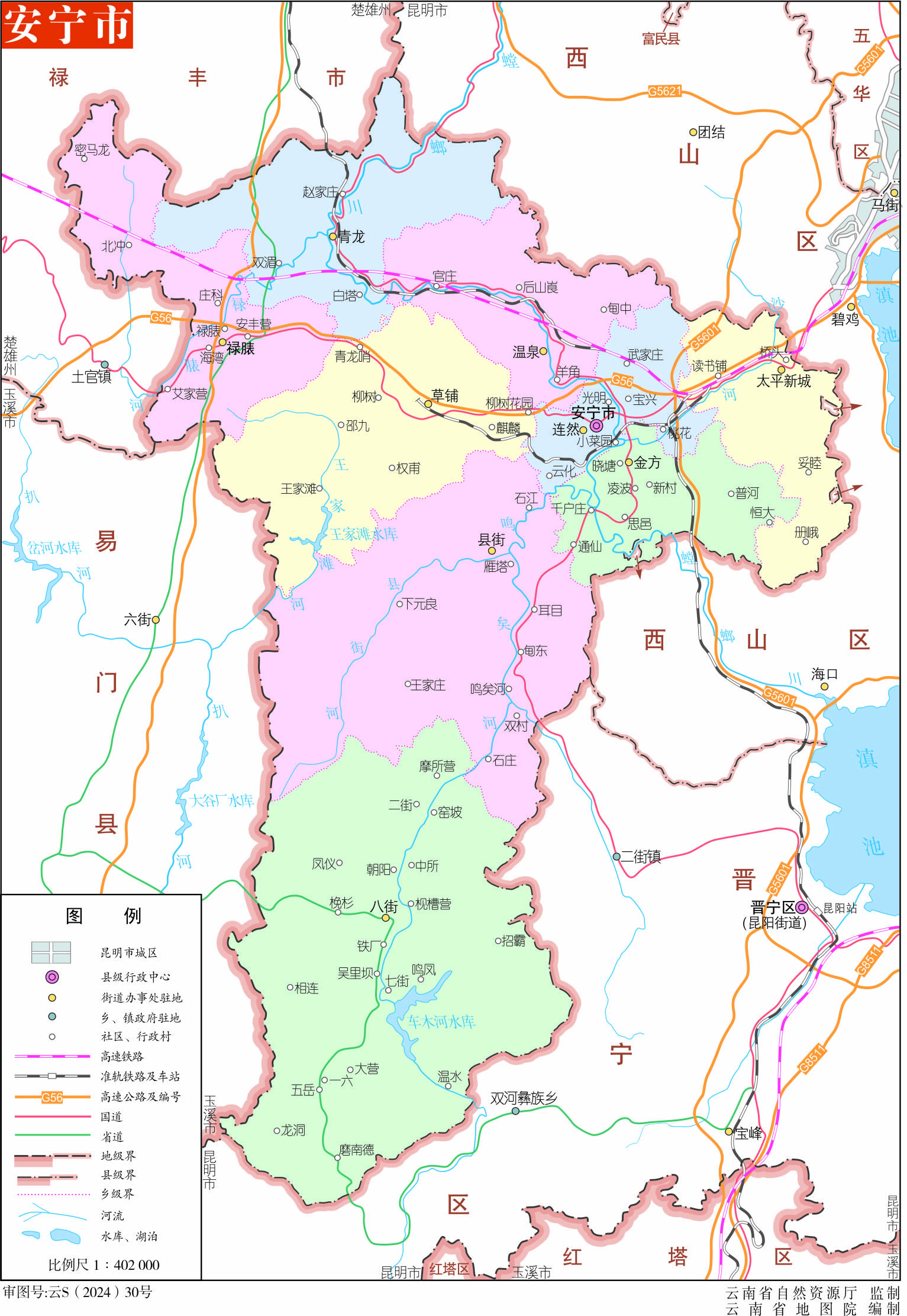 安寧市轄9個(gè)街道:連然街道、溫泉街道、太平新城街道、青龍街道、草鋪街道、祿脿街道、八街街道、縣街街道、金方街道