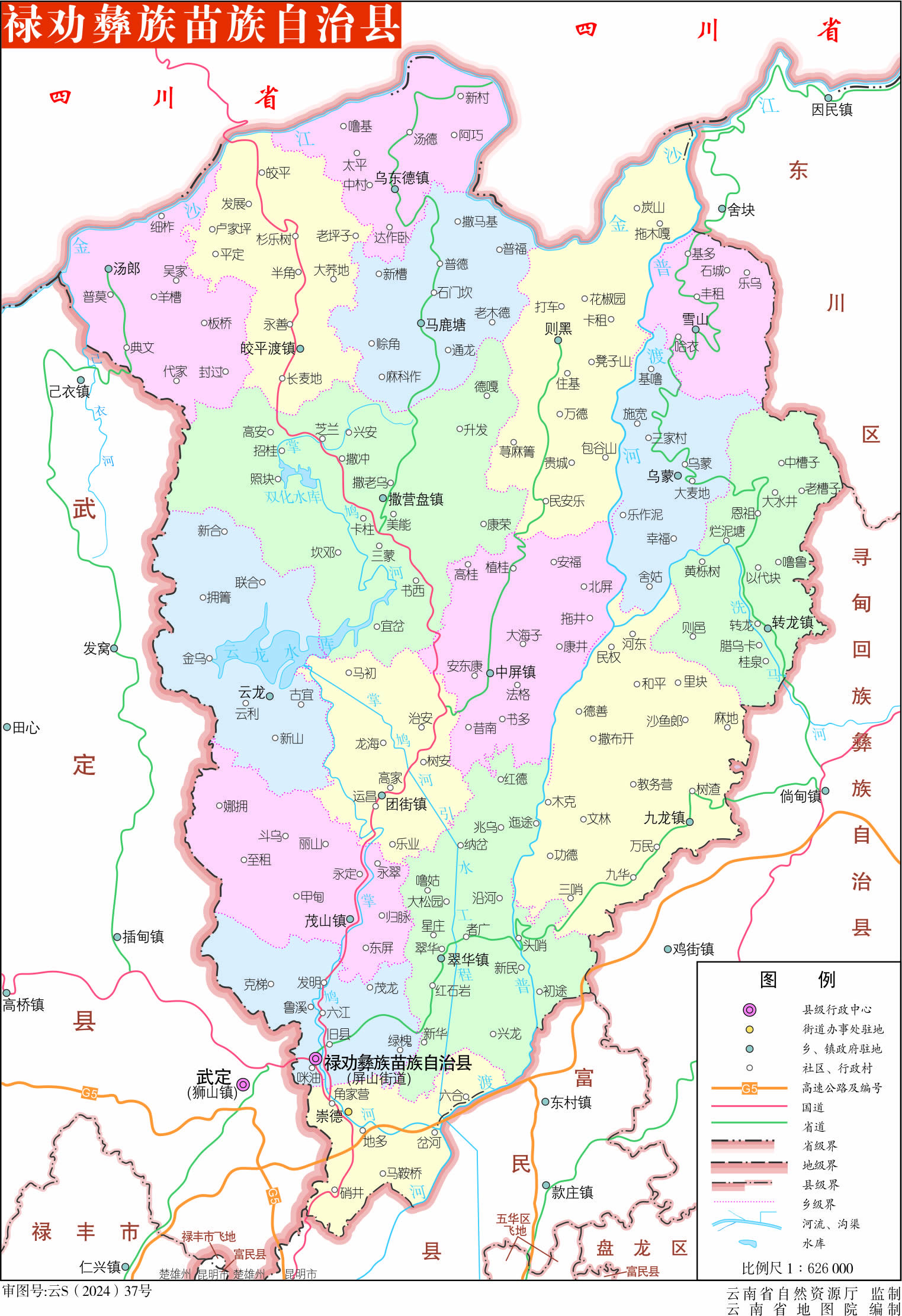 鎮(zhèn):撒營盤鎮(zhèn)、轉(zhuǎn)龍鎮(zhèn)、茂山鎮(zhèn)、團(tuán)街鎮(zhèn)、中屏鎮(zhèn)、皎平渡鎮(zhèn)、烏東德鎮(zhèn)、翠華鎮(zhèn)、九龍鎮(zhèn)