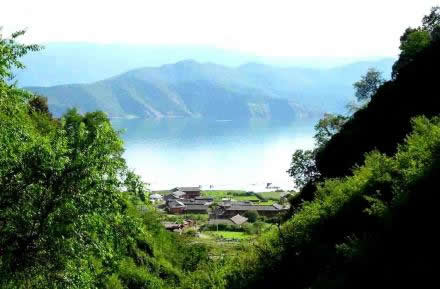 里格半島,位于東北部格姆女神山山麓,是瀘沽湖七個(gè)珍珠寶石般島嶼中的一個(gè),與謝瓦俄島,里務(wù)比島一起被譽(yù)為“蓬萊三島”。