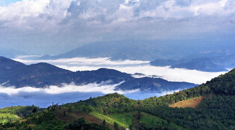 十層大山,也稱為寬羅珊山,是一座座落于中國(guó)云南省、越南奠邊省及老撾豐沙里省的山峰,為三國(guó)邊界的交界點(diǎn),海拔1864米。山頂被稱為雞鳴三國(guó),豎立有一塊花崗巖界碑,分別書(shū)寫中國(guó)、越南、老撾3國(guó)文字的界碑面向著各國(guó)的領(lǐng)土。