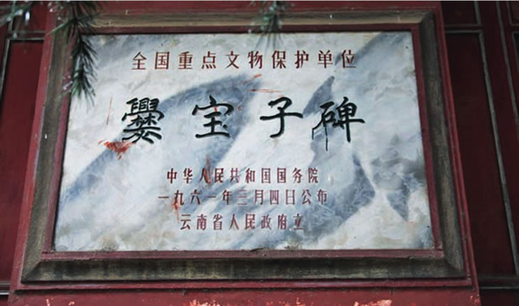 在越州楊旗出土的爨寶子碑全稱為“晉故振威將軍建寧太守爨府君墓”碑,立于東晉大亨四年(公元405年)!鹅鄬氉颖肥请`書(shū)向楷書(shū)過(guò)渡的典型碑刻;碑文通篇為六朝時(shí)期的駢文體;也是研究南北朝時(shí)期云南地方史不可多得史料。1961年,國(guó)務(wù)院將其公布為第一批全國(guó)重點(diǎn)文物保護(hù)單位。存于曲靖一中。