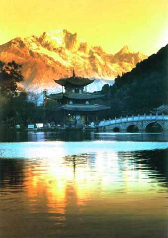 玉龍雪山隨著時令和明暗的交替,景觀也變幻無常。時而云蒸霧涌,玉龍乍隱乍現(xiàn),時而碧天如水,萬里無云,群峰像被玉液清洗過一樣,晶瑩的雪光耀目晃眼,具有"白雪無古今,乾坤失曉昏"的光輝;東方初曉,晨曦罩峰頂,多彩的霞光映染雪峰,白雪呈緋紅狀與彩霞掩映閃爍;傍晚,斜輝把雪峰染抹得像披上紅紗,云朵帶