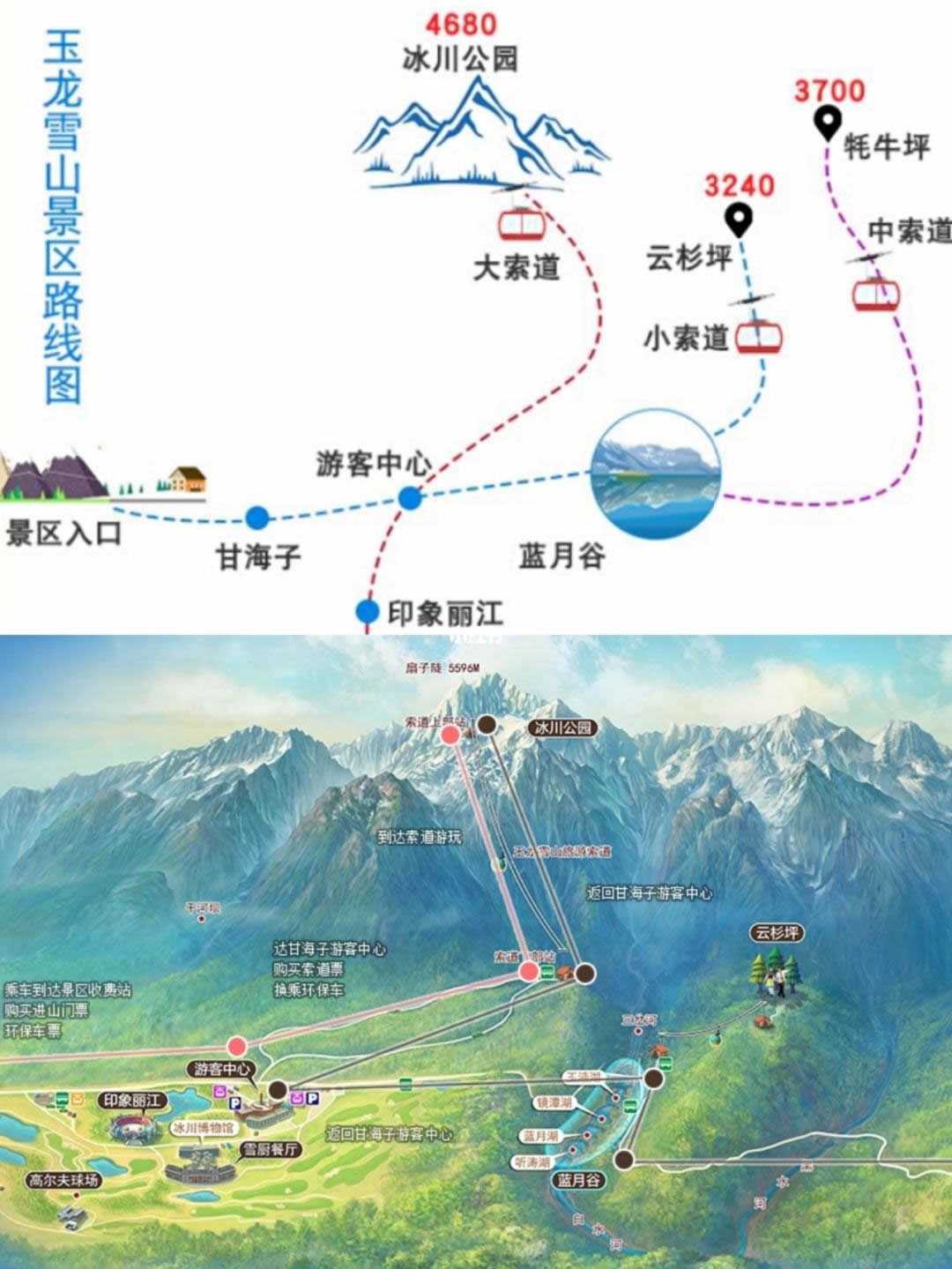 玉龍雪山冰川公園是觀賞“白水一號”現(xiàn)代冰川的最佳位置,游覽冰川公園可乘坐玉龍雪山旅游索道,該索道是通往冰川公園,涉足皚皚雪域,游覽“綠雪奇峰”的唯一通道,從海拔3356米處提升至玉龍雪山主峰扇子陡正下方海拔4506米處,索道全長2911米,垂直高差1150米。沿途可觀賞垂直帶自然景觀,遠(yuǎn)眺甘海子、白水河、牦牛坪、云杉坪等景點。