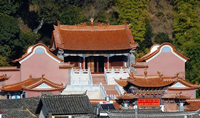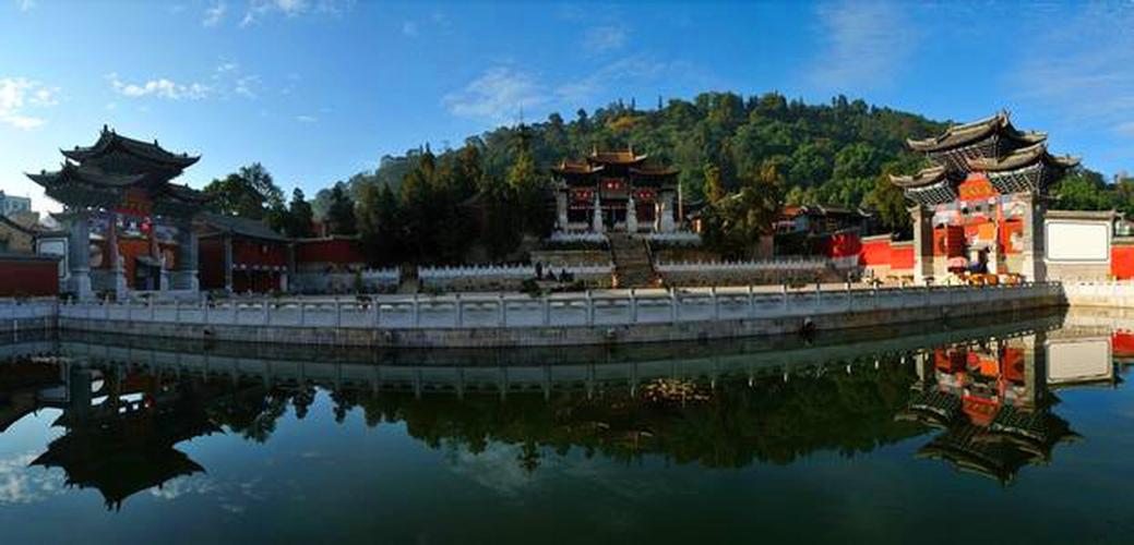 始建于元末,歷經(jīng)明清歷代重建重修,現(xiàn)為清初和清末的建筑。寺中保存下一堂(六扇)木雕槅門,出自清末滇南木雕藝術(shù)家高應(yīng)美之手,槅子門中的構(gòu)圖、布局、人物造型,被省內(nèi)外學(xué)者稱之為“海內(nèi)第一木雕”。三圣宮布局為三進式兩院,由大殿、后東西兩廂、中殿、前東西兩廂、前殿(重檐)及前、中、后的六個躲間組成,外設(shè)圍墻并呈船形,墻外雙溪環(huán)繞而過。1993年被省政府公布為“第四批文物保護單位”。