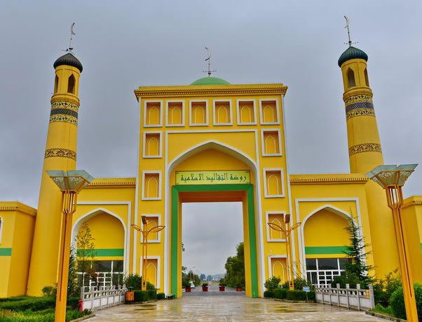 伊斯蘭風(fēng)情城是結(jié)合當(dāng)?shù)氐锰飒?dú)厚的自然環(huán)境和回族聚居條件建設(shè)起來(lái)的,占地334畝,其中水體面積100畝,中軸線長(zhǎng)1000米,除了入口廣場(chǎng)區(qū)外,還按南北空間系列分布著宗教文化展示區(qū)、演示區(qū)、水上游樂(lè)區(qū)和休閑購(gòu)物區(qū),“一軸五區(qū)”就是伊斯蘭風(fēng)情城的總體布局。伊斯蘭教信奉真主,認(rèn)主獨(dú)一,反對(duì)偶像崇拜,禁止以物喻主。信教群眾膜拜真主,每天從早到晚有5次虔誠(chéng)禮拜的儀式,稱作“禮五番”,到了周五,信教群眾就近到清真寺聚眾禮拜,稱作“注姆爾”,俗稱“主麻”。禮拜之前,每個(gè)人都必須沐浴干凈,務(wù)必常帶“大凈”,勤洗“小凈”,因而用于洗浴的茶壺也就成了信奉伊斯蘭教的一種普通標(biāo)識(shí)。