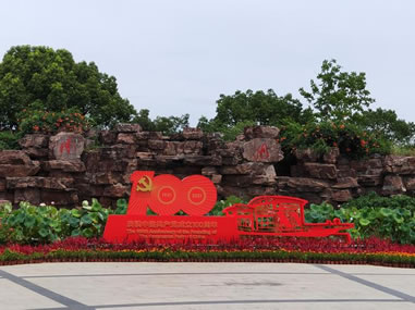 是為紀(jì)念中國(guó)共產(chǎn)黨第一次全國(guó)代表大會(huì)在南湖閉幕而建造的一座革命紀(jì)念館。作為中共“一大”會(huì)址重要場(chǎng)館和黨的誕生地,1959年根據(jù)有關(guān)部門的決定,經(jīng)中央審查同意,嘉興市籌建南湖革命紀(jì)念館,不僅仿制了南湖畫舫,還在湖心島建立了南湖革命紀(jì)念館,紅船?康暮男u成為最初的館舍,于煙雨樓大廳中開辟中共“一大”史料陳列。1991年7月,為慶祝中國(guó)共產(chǎn)黨成立70周年,紀(jì)念館移建南湖北岸,由鄧小平同志題寫?zhàn)^名,建設(shè)資金主要由黨員自愿捐獻(xiàn)。建成的紀(jì)念館由鐮刀、錘子形組成的紀(jì)念性建筑物,占地面積3800平方米,建筑面積1980平方米。紀(jì)念館坐北朝南,廣場(chǎng)上有高大威嚴(yán)的宣誓臺(tái)和大型石雕照壁以及四個(gè)火炬型花壇。在鮮花擁簇下,紀(jì)念館顯得莊嚴(yán)雄偉。沿著臺(tái)階進(jìn)入陳列大廳,正面是一艘南湖紅船模型和“中國(guó)共產(chǎn)黨第一次全國(guó)代表大會(huì)史料陳列”,兩個(gè)展廳分別布置了《中國(guó)共產(chǎn)黨第一次代表大會(huì)史料陳列》、《黨和國(guó)家領(lǐng)導(dǎo)人對(duì)南湖的關(guān)懷》等陳列,其中包括江澤民、胡錦濤、朱镕基、楊尚昆、宋平、姚依林、彭真等中央領(lǐng)導(dǎo)同志前來(lái)參觀、考察的照片和江澤民、李鵬、陳云、李先念等同志為紀(jì)念館的題詞。南湖革命紀(jì)念館是中國(guó)百個(gè)愛國(guó)主義教育基地之一,每年有近百萬(wàn)的游人前來(lái)參觀瞻仰。