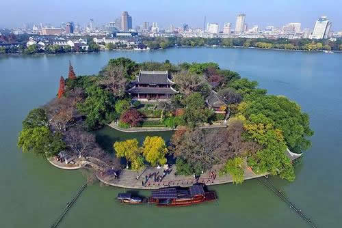 湖心島位于南湖中心,全島面積17畝。明嘉靖二十七年(公元1548年)嘉興知府趙瀛組織疏浚城河,將淤泥壘土成島,次年移建煙雨樓于島上。清以后又相繼建建成清暉堂、孤云簃、小蓬萊、來(lái)許亭、鑒亭、寶梅亭、東和西御碑亭、訪蹤亭等建筑,形成了以煙雨樓為主體的古園林建筑群,亭臺(tái)樓閣、假山回廊、古樹碑刻,錯(cuò)落有致,是典型的江南園林。