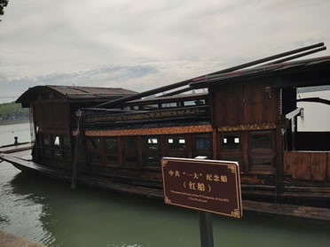 停泊在煙雨樓前水面上的,是1959年仿制的一條當(dāng)年"一大"開會(huì)的游船,作為"一大"會(huì)議紀(jì)念船,它向人們生動(dòng)展現(xiàn)了中國(guó)共產(chǎn)黨誕生的歷史場(chǎng)景。這條“一大”紀(jì)念船被人們親切地稱為“南湖紅船”。這是一艘中型的單夾弄絲網(wǎng)船,船長(zhǎng)16米,寬3米。內(nèi)有前艙,中艙,房艙和后艙,右邊有一條夾弄通道,中艙放一張八仙桌,周圍放桌凳和茶幾。當(dāng)年中共“一大”會(huì)議就是在中艙舉行。前艙搭有涼棚,房艙設(shè)有床榻,后艙置有櫥灶等物,船梢系有一條小拖梢船,為當(dāng)時(shí)接人進(jìn)城購(gòu)物所用.。1921年7月23日,中國(guó)共產(chǎn)黨第一次全國(guó)代表大會(huì)在上海秘密召開。會(huì)議臨近結(jié)束時(shí),遭法租界巡捕的襲擾而被迫停會(huì),根據(jù)上海代表李達(dá)的夫人王會(huì)悟的建議,8月1日會(huì)議轉(zhuǎn)移到嘉興南湖的一條游船上繼續(xù)舉行。在這條紅船上,會(huì)議通過(guò)了第一個(gè)《中國(guó)共產(chǎn)黨章程》,宣告了中國(guó)共產(chǎn)黨的誕生,從此中國(guó)革命翻開了新的一頁(yè)。