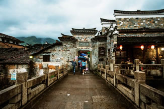 廿八都鎮(zhèn)的建筑依古道兩側(cè)而建,長(zhǎng)達(dá)1公里。北為洵里街,以住宅為主;南為楓溪街,以經(jīng)商為主。古鎮(zhèn)在清同治年為鼎盛期,光飯鋪酒店就50多家,南北雜貨批發(fā)商有40多家。然而更讓人注目的則是這里的橋、廟、閣等公共建筑。水安橋,一座廊橋橫架于楓溪之上,在晨霧的繚繞和夕陽的照耀下,展現(xiàn)出不同的側(cè)面,著實(shí)謀殺了我們不少膠卷。勞作了一天的人們和嬉戲倦了的孩童在廊橋休憩,又為這美景增色幾分。楓溪橋是典型的石拱橋構(gòu)造,它與周邊的水星廟構(gòu)成了一副恬淡而抒情的中國畫。其余的如花橋之類的只空留地名而已,原橋的構(gòu)造不復(fù)存在了。