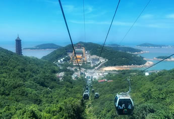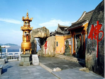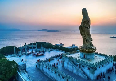 普陀山,位于浙江省舟山市普陀區(qū),杭州灣南緣,舟山群島東部海域,相傳是觀世音菩薩教化眾生的道場。普陀山地形呈菱形狀,是舟山群島1390個(gè)島嶼中的一個(gè)小島,形似蒼龍臥海,面積12.52平方千米,與舟山群島的沈家門隔海相望,素有“海天佛國”、“南海圣境”之稱,南北長8.6千米,東西寬約3.5千米,岸線長30千米。中部佛頂山天燈臺最高,海拔291.2米,向四面延伸,西為茶山,北為伏龍山,東為青鼓壘山,東南為錦屏山、蓮臺山、白華山,西南為梅岑山,主峰均在100至200米間,連綿起伏。