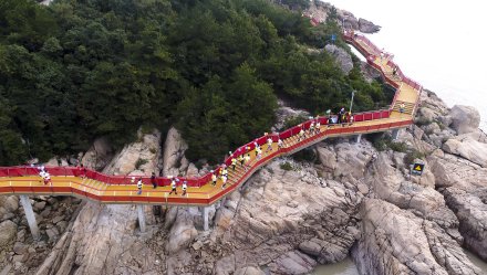 松蘭山游步道位于松蘭山沿海岸線,南起東沙灘,北至白沙灣,以棧道形式沿濱海礁石海灘穿行,全長3.1公里,平均寬度為2.5米,總面積約12萬平方米。棧道是集公眾性、休閑性、生態(tài)性為一體的高品質(zhì)濱海慢行步道,沿線設(shè)置濱海眺臺、觀景平臺等,全程以紅色為主調(diào),素有“海上紅絲帶”之美譽(yù)。