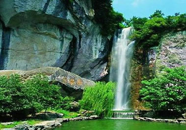 雙龍出海第二洩:二洩緊接一洩,落差為7.1米。瀑布下落時(shí),被一塊兀石分成兩半,分流如珠簾飄動(dòng),開(kāi)朗而又深沉,又如雙龍出游不知天高地厚,古人有詩(shī)贊其曰:兩龍爭(zhēng)壑不知應(yīng),一石橫空不渡人。