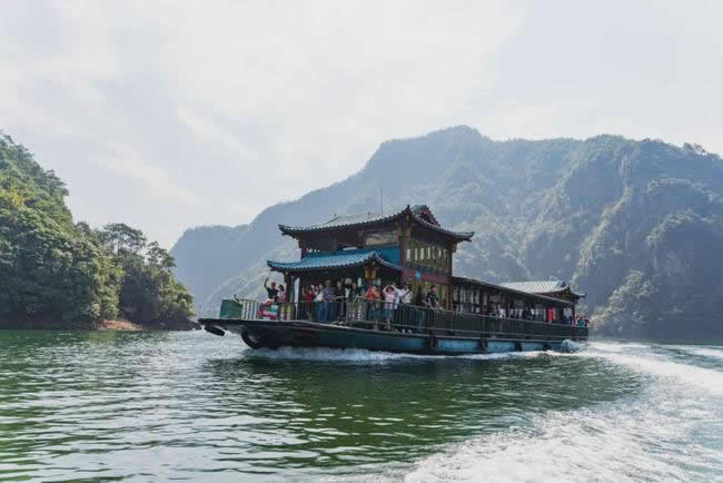 由紫藤長(zhǎng)廊拾階登上壩頂,眼前展現(xiàn)的是一湖靜水,綠水蕩漾,深不可測(cè)。 水面上疾駛的游船,不時(shí)激起層層漣漪,把兩岸的元寶峰,鷲鷹峰,仙桃峰、杜鵑峰、老僧峰、仙掌峰等山峰的倒影彎折。 泛舟湖上,水鳥(niǎo)在水面低飛,狹長(zhǎng)的湖面見(jiàn)不到盡頭,大有“青山綠水景無(wú)盡”之感,又有“一折青山一扇屏,一彎綠水一古琴”的詩(shī)意。沿湖兩邊,蔥蘢俊秀,美不勝收。春天萬(wàn)木崢嶸,紅杜鵑從綠樹(shù)叢中透出;夏天滿山蔥郁,濃蔭蔽日;一到秋冬季節(jié),蒼黃的銀杏葉和紅艷的楓葉,點(diǎn)綴在一片蕭瑟之中。