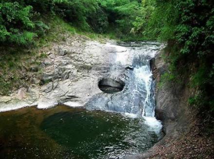 瀑布下面的深潭大約5米,黝黑無(wú)底,俗呼“大腳桶潭”。