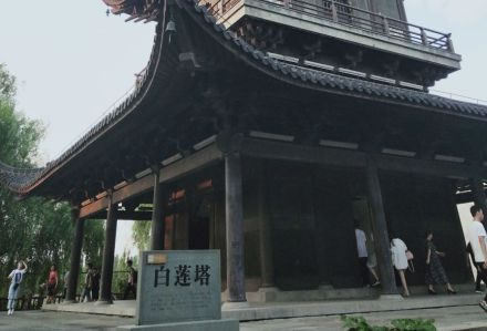 白蓮塔位于西柵大運河畔的環(huán)河島上,白蓮塔高有七級,塔高約51米,為烏鎮(zhèn)最高建筑,塔下有八角形的升蓮廣場,廣場中有放生池,東側河岸邊有一條石舫。白蓮塔屬于宋元時期江浙一帶通行的磚木混合結構的閣式塔,縱觀其塔,外觀呈梭狀,實際上塔的平面是呈正方形的,塔基也是一個24米乘24米的正方形,內(nèi)部地面用清水方磚鋪就而成。