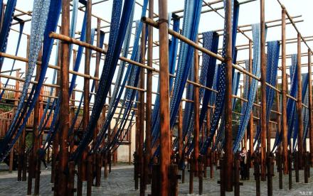草本染色作坊是手工環(huán)保印染晾曬大型工坊。曬布場地以青磚鋪就,豎立著密密麻麻的高桿和階梯式曬布架,規(guī)模相當龐大。草木本色染坊除了以藍草為原料漿染制作藍印花布工藝外,還有獨特的彩烤工藝流程。彩烤色彩豐富,是從當?shù)氐牟菽驹现刑崛〉,像茶葉、桑樹皮、烏桕樹葉都是提取色彩的原料,所以這個染坊在當?shù)亟凶霾菽颈旧痉弧?