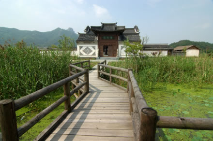 陸家莊在《神雕俠侶》中是陸展元、陸立鼎兩兄弟的莊院,小說第一回中寫道的故事情節(jié)就是在這府院發(fā)生的。陸家莊是影城中相對獨(dú)立的一個(gè)景點(diǎn),主要由碼頭、風(fēng)雨亭、路棚、陸家莊院和農(nóng)戶院組成。這里三面有湖,展現(xiàn)的是古代農(nóng)村自然淳樸的風(fēng)格和農(nóng)家田園風(fēng)光。