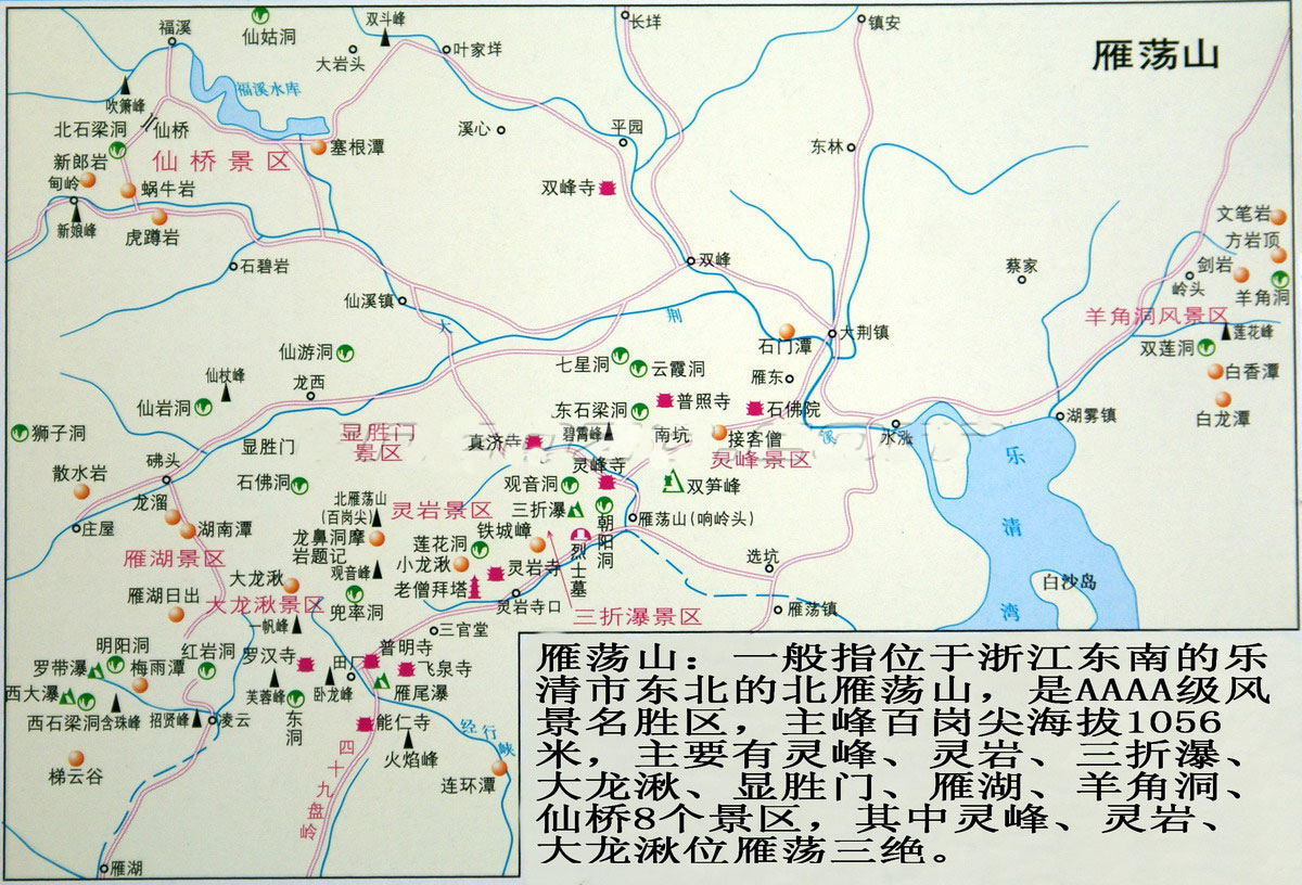 北雁蕩山位于樂(lè)清市境內(nèi)東北部,萬(wàn)山重疊,群峰爭(zhēng)雄,懸嶂蔽日,飛瀑凌空,古木參天,自古就有“寰中絕勝”之譽(yù),是全國(guó)十大名山之一。北雁蕩山有102峰、64巖、26石、46洞、14嶂、18瀑、28潭、13坑、13嶺、10泉、2水、8門(mén)、4闕、7溪1澗、8橋2湖、5尖2峽等,由此將其分為靈峰、靈巖、大龍湫、顯圣門(mén)、雁湖5個(gè)景區(qū)。