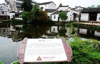 鐘池位于諸葛村的中心,在大公堂正前面,面積0.24公頃,它的邊上是一塊與它逆對(duì)稱面積的陸地,村民用以曬場(chǎng)之用。易經(jīng)上說(shuō)“東南為陽(yáng)、西北為陰”再加上“天圓地方”之說(shuō),空地和鐘池正呈陰陽(yáng)太極圖形。陸地靠北和鐘池靠南各有一顆水井,正是太極中的魚(yú)眼。鐘池的南岸是一個(gè)陡坡,順著陡坡而建的幾幢大房子從北岸望去一幢比一幢高,加上前面貼水一溜小平房,跌宕起伏,輪廓線大起大落,景象峭拔而優(yōu)美。